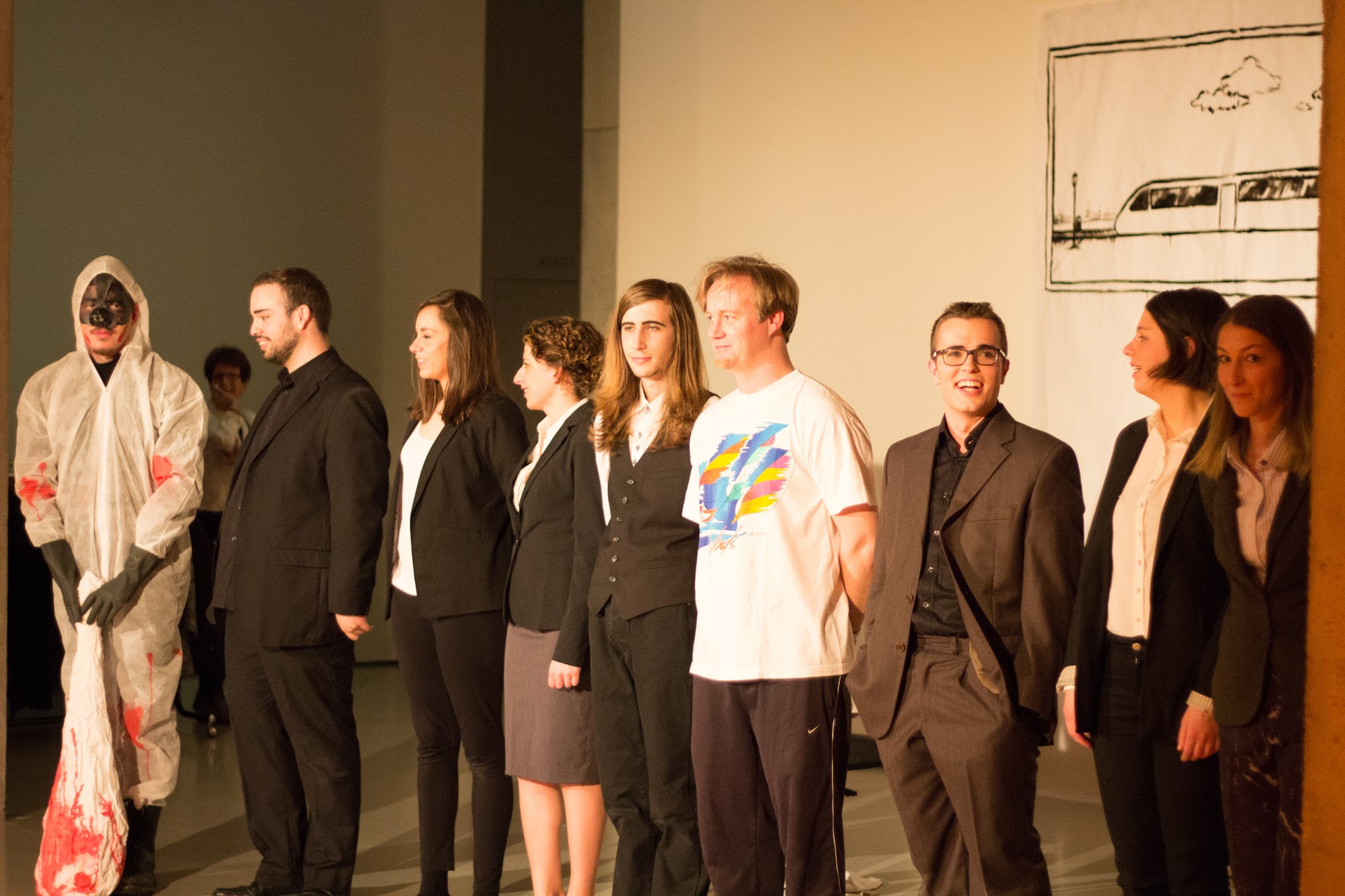 Carla Martín: Sí, de hecho, muchas veces salen noticias de que ha habido un accidente en la autovía y los coches seguían pasando, no se paraban a socorrer al herido. Volviendo al tema de los medios de comunicación, queremos informarnos sobre lo que pasa en el mundo, sobre cuántos niños mueren en África por el hambre… pero hasta cierto punto. Solo saber un número. Hasta ahí, el resto de la tragedia no nos interesa. Esta escena es la crítica contra esa indiferencia, el estado del bienestar muchas veces obnubila nuestra percepción de los actuales problemas del mundo.