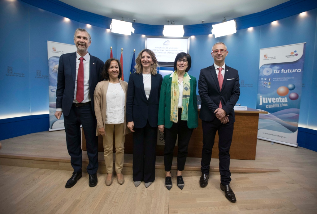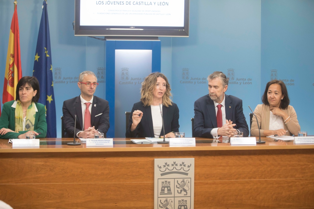 La consejera de Familia e Igualdad de Oportunidades, Alicia García; el rector de la Universidad de Burgos, Manuel Pérez; el rector de la Universidad de Salamanca, Ricardo Rivero; la vicerrectora de Estudiantes y Empleo de la Universidad de León, Ana Isabel García; y la vicerrectora de Estudiantes y Extensión Universitaria de la Universidad de Valladolid, Felicidad Viejo, han presentado la puesta en marcha del programa ‘VIVEUROPA CyL’.